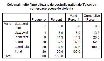 In proportie de 37,5%, sunt de acord cu faptul ca cele mai multe filme difuzate de posturile nationale de televiziune contin numeroase scene de violenta, in vreme ce 46,3% dintre acestia sunt de acord cu faptul ca emisiunile de stiri reflecta un grad ridicat de agresivitate fizica si verbala.