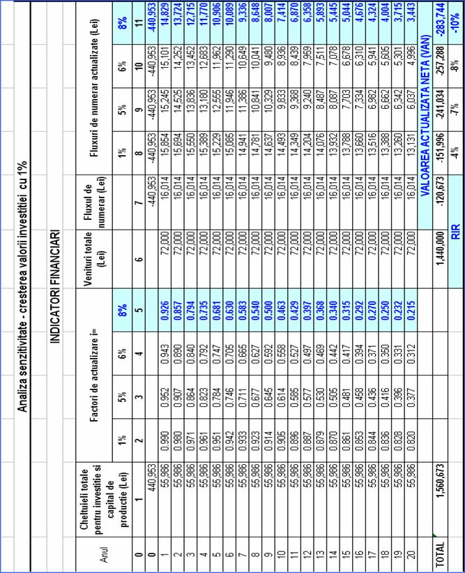 Cresterea cheltuielilor cu 1%, determina scaderea valorii actualizate nete, RIR si ratei B/C, afectand in sens negativ investitia. Fluxul de numerar cumulat ramane pozitiv in fiecare an al perioadei de referinta.