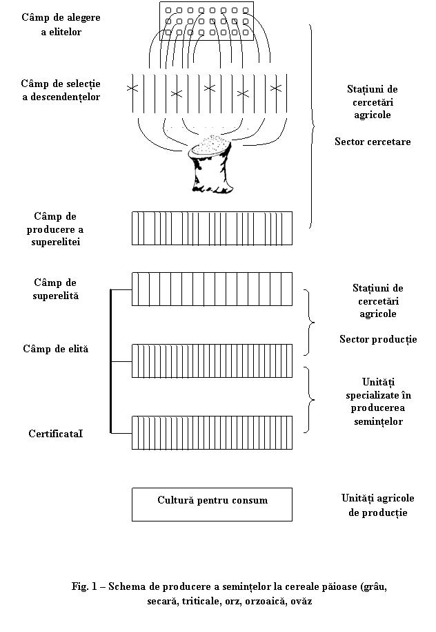Producerea de samanta din verigile 1-3 se executa in cadrul laboratoarelor de ameliorare si producere de seminte ale statiunilor experimentale din reteaua AS AS. Producerea semintei superelita si elita se face in sectorul de productie al statiunilor experimentale, iar inmultirea I in unitati agricole de productie si asociatii agricole.