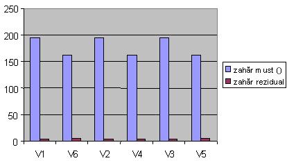 In graficul din figura 3 se poate observa faptul ca susa 8216 are o capacitate de multiplicare diferita pe cele doua musturi cu origini geografice diferite. Astfel, in timp ce pe mustul originar din zona Vrancea (Focsani), notata V1 susa intra imediat in faza de multiplicare (in primele 5 ore de la inoculare); pe mustul originar din sudul tarii (V6) ea inregistreaza o faza de lag de 10 ore. Faza de accelerare dureaza pe mustul de Focsani 35 ore, iar pe mustul din sudul tarii, 30 ore. Punctul maxim al cresterii logaritmice este atins in ambele situatii la aproximativ 35 - 40 ore de la inoculare. In conditiile in care densitatea microbiana initiala la inoculare a fost aceeasi pe ambele musturi, totusi, pe mustul de Focsani, densitatea maxima a populatiei microbiene este superioara celei inregistrate pe mustul din sudul tarii. Pe mustul de Focsani, susa 8216 se mentine la cota maxima de multiplicare timp de 5 ore, dupa care incepe faza de declin. Aceasta este insottita de limpezirea puternica si rapida a lichidului in fementatie si de un consum al zaharului rapid, asa cum vom vedea in cele ce urmeaza. Pe mustul din sudul tarii, susa 8216 are o anumita lentoare in fermentatie, dar dupa aproximativ 15 ore de la atingerea varfului de crestere a populatiei, incepe si in acest caz limpezirea lichidului si scaderea densitatii microbiene. De asemenea, in timp ce dupa 55 ore, pe mustul de Focsani s-a inregistrat deja o limpezire totala, concretizata prin valori ale absorbantei de 0,068, pe mustul din sudul tarii, dupa acelasi interval de timp turbiditatea este mai accentuata (valori ale absorbantei de 0,188), procesul de fermentatie continuand inca. Dupa alura curbei de multiplicare, fermentatia ambelor categorii de must cu susa 8216 are loc in conditii normale.