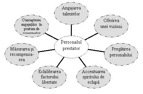 Personalul: Personalul care cunoaste si presteaza serviciile oferite si are capacitatea de a recunoaste si intelege necesitatile clientilor; selectia acestui personal, motivarea acestuia, instruirea in sensul atentiei acordate consumatorului;