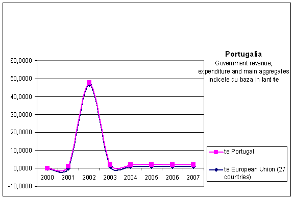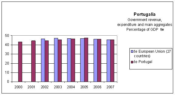 Din 2002 EU27 se afla o scara crescatoare doar in 2003 anul cu cel mai mari cheltuieli de 47,3,in medie EU27 inregistreaza o mentinere a cheltuielilor 46,9 cu o descrestere usoara in 2006 respectiv 2007.Portugalia realizeaza cheltuieli care variaza de la un ala altul dar care nu depasec cu mult cele din EU27 Cele mai mici sunt in anul 2000 de 43,1 ,cu o usoara crestere pana in 2005 fiind cele mai multe de 47,6 si mentinand un echilibru la caelas nivel cu EU27 in ani 2006 si 2007 de 46,3 respectiv 45,6 desi ambele se remarca in ultimul an printr-o scadere