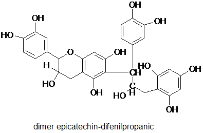 Proantocianidolii prezenti sunt dimerii B-2 [epicatechol (4β-8) epicatechol] si B-5 [epicatechol (4β-6) epicatechol], trimeriul C1 [epicatechol (4β-8)-epicatechol (4β-8) epicatechol], tetrameri si oligomeri. Alaturi de acestia se mai gasesc taninuri catechice (epicatechol si catechol), un dimer epicatechin-difenilpropanic, un biflavan (4,8 - bis epicatecholul), flobafene. Dimerul epicatechin-difenilpropanic rezulta prin condensarea L-epicatechinei cu propriul ei produs de degradare in mediu acid (format prin deschiderea ciclului piranic).