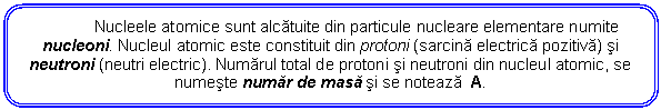 a. Aproape toata masa atomului este concentrata intr-un volum foarte mic care constituie nucleul atomic. Nucleul atomului are un diametru de 10-14 - 10-15 m, mult mai mic decat diametrul atomului (10-9 - 10-10 m).