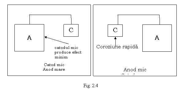 Rata coroziunii galvanice. Rata coroziunii galavnice poate fi controlata fie prin controlarea activitatii la anod sau la catod, fie prin controlul rezistentei drumului electronic. Forta care determina reactia este determinata de diferenta de potential dintre anod si catod. Metalele care sunt apropiate in seria galvanica se vor coroda mai putin decat cele mai departate. In conditii obisnuite, limitarea se face prin controlul activitatii de la catod. Coroziunea anodului se produce la fel de rapid cu consumul de electroni de catre catod. Daca anodul este acoperit, iar catodul este descoperit, coroziunea la anod se face foarte rapid.