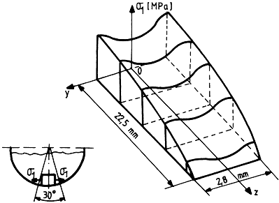 Folosind feliile transversale rezultate prin sectionarea cilin-drului in afara zonei de contact, in figura (43) s-a trasat variatia spatiala a tensiunii principale σ1 din aceasta zona, pe grosimea de 2.8 mm a feliei.