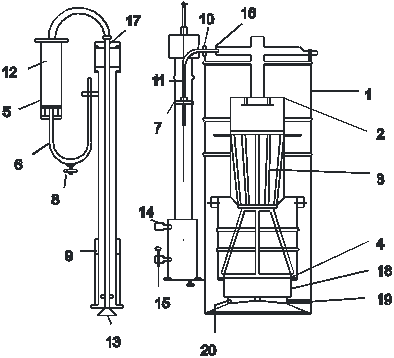 1 - corpul generatorului; 2 - clopotul de acumulare; 3 - cos pentru carbid; 4 - cos pentru reziduri; 5 - filtrul de acetilena; 6 - stut de golire; 7 - robinet cana; 8 - robinet de evacuare a aerului; 9 - supapa ; 10 - brida de stringere; 11 - racord; 12 - cocs metalurgic; 13 - piulita dop; 14 - racord furtun; 15 - robinet de nivel; 16 - piulita olandeza; 17 - pilnie supapa; 18 - inchizator; 19 - piciorus; 20 - deschizator.
