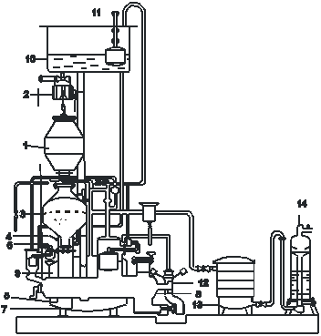1 - container pentru carbid; 2 - instalatie de ridicat; 3 - buncar pentru carbid; 4 - instalatie dozare - alimentare carbid; 5 - camera de generare; 6 - motor hidraulic; 7 - melc pentru amestecare; 8 - ecluza (spatiu depunere namol); 9 - spatiu acumulare acetilena; 10 - rezervor pentru echilibrarea presiunii; 11 - ventil cu plutitor; 12 - ventil pentru evacuarea namolului; 13 - epurator; 14 - supapa hidraulica centrala.