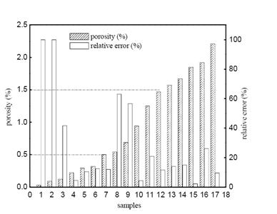 In Figura 5. va prezentam erorile relative ale rezultatelor analizelor porozitatii. Se remarca ca cele mai multe erori sunt mai mici de 25%. Bineinteles, ne-am gandit sa impartim in trei mostre mici poroase de 0 % ,0,09% si 0,12%, iar porozitatea de 0,54% si 0,69%. Pot exista doua motive pentru a explica aceste dezacorduri. Pentru inceput, este dificil sa ne asiguram ca aria de testare cu ultrasunete nu deviaza de la locatia de observare metalografica. In al doilea rand, forma, marimea si modul de distribuire al porilor sunt intamplatoare in tot volumul,ceea ce poate cauza unele fluctuatii ale atenuarii ultrasonore.