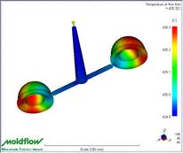 Analizand simularile prezentate in figurile 23 si 24 se poate observa ca temperatura topiturii de material este simetrica pentru ambele cuiburi iar presiunea in punctul de injectare are o variatie care va conduce la umplerea completa a cuiburilor deci se poate concluziona ca forma si dimensiunile canalelor de alimentare au fost bine alese si dimensionate dupa simulari repetate. Forta de inchidere a matritei (fig. 2) poate fi asigurata de masina de injectie ARBURG Golden Edition 320 achizitinata in cadrul proiectului aflat in derulare.