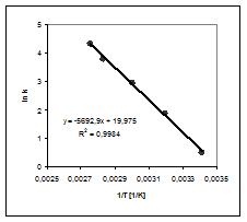 astfel ca identificarea cu relatia (A.1) conduce la necesitatea logaritmarii constantei de viteza si la inversarea temperaturii in vederea aplicarii algoritmului (prelucrare primara in raport cu regresia). Ulterior aflarii constantelor, trebuie facuta delogaritmarea lui b0 pentru aflarea lui k0, respectiv inmultirea cu (- RG) pentru calculul energiei de activare.