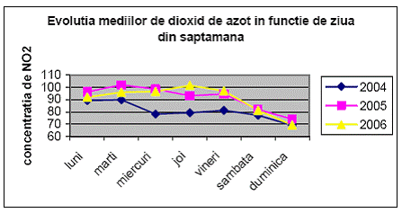S-a mai remarcat ca structura traficului s-a schimbat in anii 2005 si 2006 (ziua in care au fost inregistrate concentratiile cele mai ridicate fiind miercurea), fata de anul 2004 (cand concentratiile cele mai ridicate se inregistrau martea).