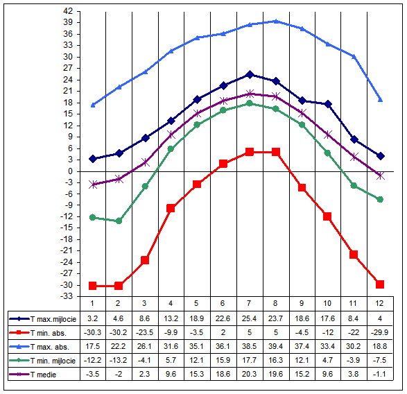 Temperatura aerului. Dintre elementele climei, temperatura aerului este parametrul cel mai important; ea inregistreaza, in timp, un grad mare de variabilitate determinand, astfel si modificarea celorlalte elemente climatice. Temperatura aerului dintr-un loc sau o regiune, ca si regimul ei anual, este determinata de un complex de factori, in care rolul principal il are radiatia solara si circulatia generala a atmosferei, la care se adauga si particularitatile pe care le au conditiile fizico-geografice regionale si locale. Influenta tuturor acestor factori si variatia valorilor medii si extreme ale temperaturii aerului la Botosani indica existenta unui climat temperat continental, cu nuante excesive.