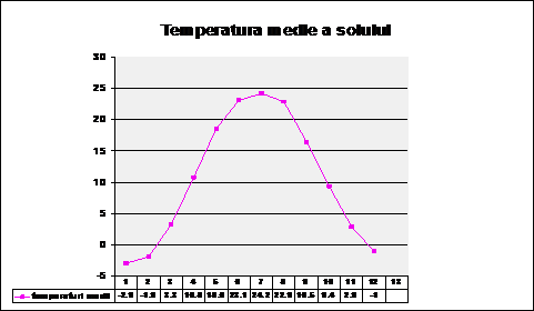 a. Datorita asezarii geografice a orasului Botosani - 47s44´ latitudine nordica si 26s41´ longitudine estica, razele solare cad in cursul anului sub un unghi destul de diferit ca valoare, intre solstitiul de iarna (18s33´) si solstitiul de vara (65s 27´); aceasta impune variatia in timp a cantitatii de caldura primite. Acest fapt nu este singurul raspunzator pentru explicarea maximului de iarna (-4,8s C in ianuarie) si maximul de vara (20,3sC in iulie) din curba regimului termic al Botosanilor.
