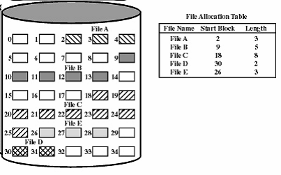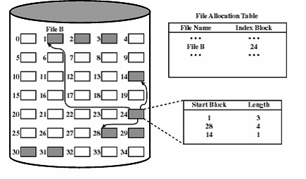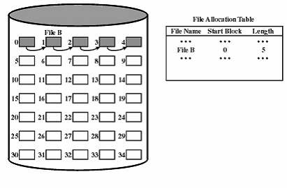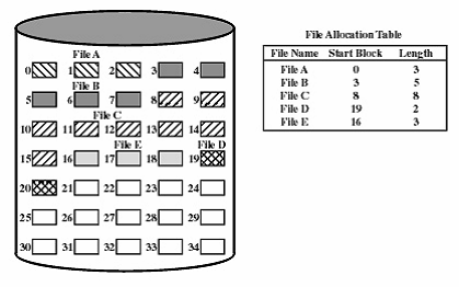Acest tip de alocare este ideala pentru fisierele secventiale. Singura problema este ca poate aparea o fragmentare externa facand dificila obtinerea spatiului pentru alocarea blocurilor de dimensiuni mari. De aceea este necesar sa se efectueze periodic o operatiune de compactare pentru a elibera spatiu suplimentar.