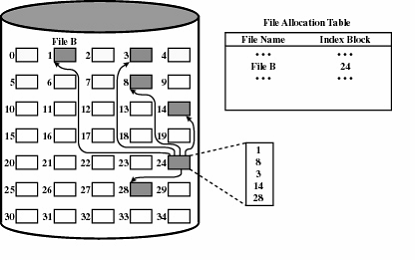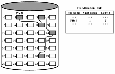 La cealalta extrema se afla alocarea inlantuita. In acest caz alocarea se face la nivel de blocuri individuale. Fiecare bloc contine o referinta catre urmatorul bloc din lant. Si in aceasta situatie este nevoie doar de o intrare pentru fiecare fisier in tabela de alocare a fisierelor. In acest caz nu se pune problema fragmentarii. Acest tip de organizare este ideal pentru fisierele secventiale ce se vor procesa secvential. Problema ce poate aparea este necestitatea de a face accese in diferite zone ale discului. Pentru a corecta acesta problema este necesar sa se faca periodic o compactare a fisierului.