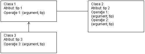Remarcati ca fiecare bloc ilustrat in Figura 4 reprezinta un obiect pentru care structura de mostenire este in mod clar indicata de directia sagetii: obiectul de tipul Clasa 1 este o superclasa a obiectului de tipul Clasa 3. Intr-un design real ce foloseste modelul obiectual unificat, linia orizontala ar contine informatii despre tipul de relatie (unu-la-unu, multe-la-multe, unu-la-multe) si despre agregarea unor obiecte multiple intr-un singur obiect. Omitem aici aceste detalii.