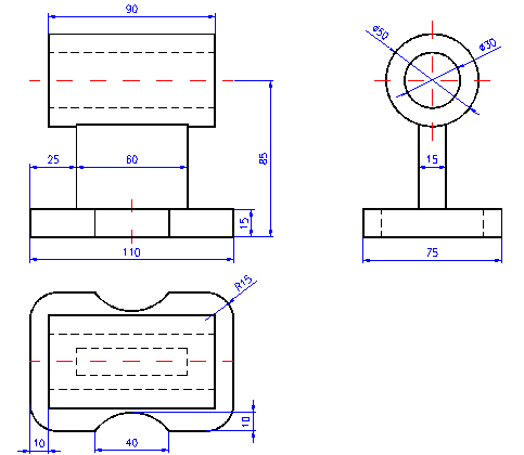 Sa se realizeze desenul piesei figura 1 (reprezentata in trei proiectii ortogonale - vedere din fata, vedere de sus si vedere laterala), folosind comenzile de desenare si editare AutoCAD, cu gruparea diferitele informatii grafice pe layere.