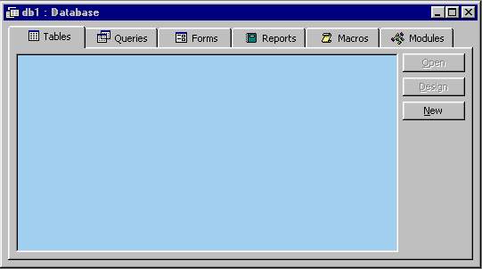 Apasand OK ajungeti la fereastra din figura 8. Ce vedeti in figura 8 este o BD noua, necompletata ; prin selectia oricareia din etichetele cu numele obiectelor unei BD ( 'tables', 'queries' s.a.) ce apar in partea de sus a ferestrei, veti vedea ca nu exista nimic creat. Sarcina noastra este sa cream, pe parcursul lucrarilor de laborator, fiecare dintre aceste obiecte ;