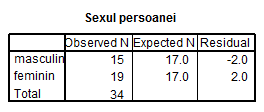 Interpretare: In tabelul frecventelor sunt comparate frecventele observate cu frecventele teoretice. Diferentele sunt prezentate pe categorii in coloana Residual. Se observa ca sunt 15 persoane de sex masculin si 19 de sex feminin. Conform ipotezei de nul, pentru fiecare categorie ar trebui sa fie cate 17 persoane. In coloana Residual sunt prezentate diferentele fata de valorile teoretice, pentru fiecare categorie: -2 si 2.