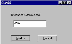 Primul pas cere introducerea numelui clasei. Daca se apasa "cancel" se va afisa un mesaj prin care se anunta ca s-a renuntat la crearea clasei.Dupa ce se va apasa "ok" se va iesi din program.