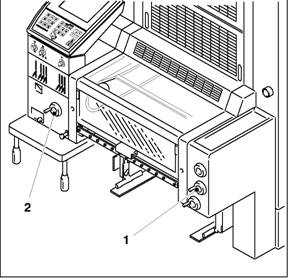 Functia Pentru a extrage o coala de proba, trebuie sa trageti butonul "Retinator de coli" in afara. Atunci retinatoarele de coli se deplaseaza deasupra colii superioare din tiraj la stiva de la eliminarea colilor. Opritoarele frontale ale colilor se rabateaza in sus. Urmatoarele coli din tiraj se depun acum pe retinatoarele de coli. Puteti extrage acum coala superioara din tiraj sub forma de coala de proba de pe stiva Dupa impingerea butonului, retinatoarele de coli se deplaseaza inapoi. Colile din tiraj depuse se reunesc din nou cu stiva de la eliminarea colilor. Extragerea colilor de proba Trageti butonul pentru retinatoarele de coli (fig. /1) in afara Cele doua retinatoare de coli se deplaseaza in eliminarea colilor si opritoarele frontale ale colilor (fig. /2) se rabateaza in sus. Extrageti coala de proba de pe stiva de la eliminarea colilor. Impingeti butonul (fig. /1) inapoi in pozitia initiala |