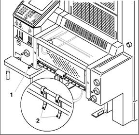 Reglarea franei pentru coli la latimea formatului Desfaceti surubul cu cap striat (fig. /2) din spatele traversei (fig. Mutati frana pentru coli (fig. /1) pe traversa in afara imaginii tiparului. Strangeti din nou ferm surubul cu cap striat.
