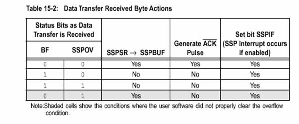 Din SSPSTAT este resetat.Adresa receptionata este incarcata in SSPBUF .Cand aparae un overflow pentru octetul de adresa nu se genereaza un ACK.O conditie de overflow este definita fie prin BF (este setat) fie prin SSPOV (este setat).Deci cand un octet este primit ,cu aceste conditii,si se incearca mutarea lui din SSPSR in SSPBUF nu este generat ACK.