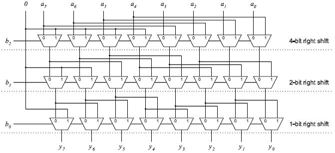 Shift and rotate examples for A = a7a6a5a4a3a2a1a0 and B = 3.