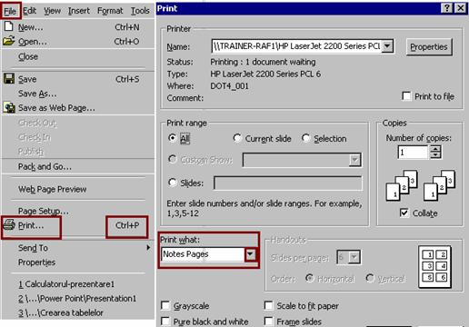 Pentru a tipari insemnarile prezentatorului trebuie sa urmezi pasii: