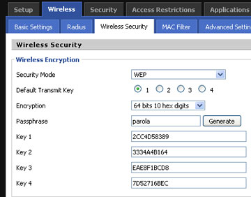 Security, urmatoarele: WEP, key 1, 64 bits, passphrase parola