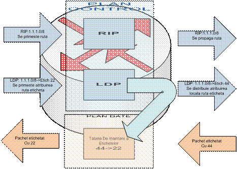 In exemplul de mai sus este explicat cum este folosit planul de control pentru a crea planul de date. Protocolul de rutare RIP primeste ruta 1.1.1.0/8, o instaleaza in tabela de rutare si o propaga mai departe catre alte rutere vecine. De asemenea protocolul de schimbare a etichetelor LDP primeste eticheta 22 atribuita retelei 1.1.1.0/8 de catre ruterul vecin, aceasta atribuire este instalata in tabela de etichete (FIB). O alta eticheta 44 este atribuita local si apoi propagata prin LDP la ruterul vecin. In planul de date este creata legatura intre eticheta 44 si eticheta 22, astfel atunci cand un pachet etichetat cu eticheta 44 ajunge la ruter, acest pechet este trimis spre ruterul vecin si eticheta este schimbata in 22.