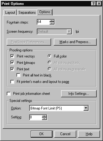 Sectiunea Options ne da posibilitatea de a stabili numarul de pasi in care se face trecerea de la o culoare la alta in cadrul unui gradient, numarul maxim de pasi fiind 250; cu cat numarul de pasi este mai apropiat de valoarea maxima cu atat degradeul este mai fin. In cadrul sectiunii Proofing options putem indica programului Corel ce anume sa listeze din obiectele de pe pagina, de exemplu: deselectand optiunea Print text nu va mai fi imprimat textul de pe pagina. Tot aici putem indica programului in ce mod de culoare sa imprime. In cadrul sectiunii Special settings putem indica programului cum sa imprime imaginile bitmap. Aceasta optiune este bine sa fie lasata nemodificata, in caz contrar rezultatele putand fi greu de controlat.