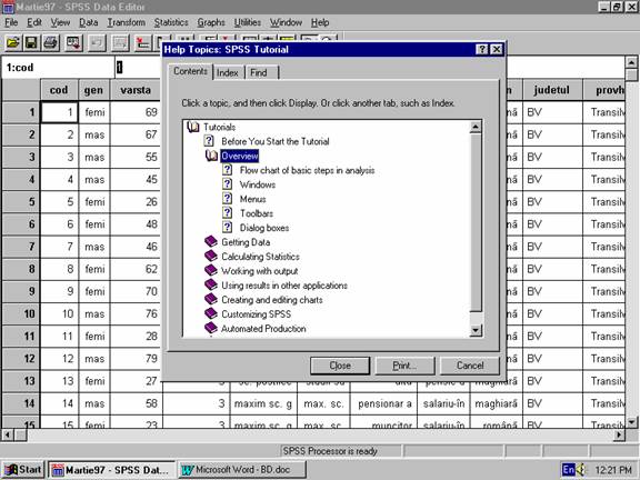 Meniul Help ofera multiple posibilitati de a obtine ajutor interactiv. Procedura Topics permite accesul in manualul electronic pe baza unor optiuni tematice, procedura Tutorial este indicata pentru un prin contact cu PACHETUL STATISTIC PENTRU STIINTELE SOCIALE (vezi figura 1.4), iar procedura Statistics coach este un meditator pentru procedurile statistice. Unele din proceduri contin demonstratii interactive, cele mai multe contin ilustratii si toate contin explicatii textuale in limba engleza.