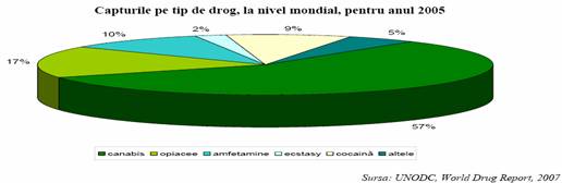 La nivel mondial, capturile de droguri au crescut, in anul 2005, cu 21% mai mult decat in anul precedent, statele membre raportand catre Biroul Natiunilor Unite privind Drogurile si Criminalitatea 1,5 milioane de capturi de droguri. Din totalul capturilor de droguri, mai mult de jumatate (57%) sunt reprezentate de canabis (iarba, rezina, ulei, planta, seminte), 17% de opiacee dintre care 14% numai heroina, 12% de grupul stimulentelor de tip amfetaminic (5,5% metamfetamine, 2,5% amfetamine, 2% ecstasy, 2% alte tipuri de amfetamine) si 9% de cocaina.