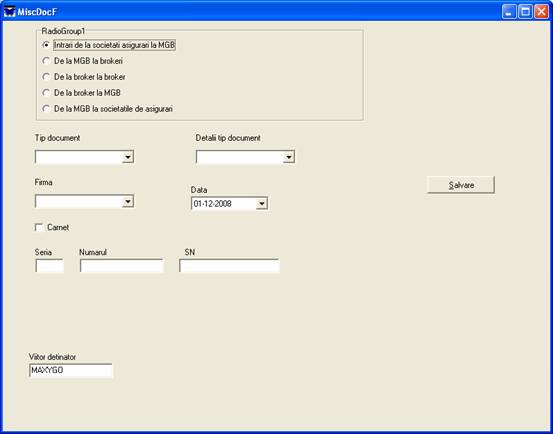 In partea de sus se alege miscarea documentului. In functie de ce s-a ales apar anumite campuri sau dispar. Se completeaza absolut toate campurile care apar si la final se apasa "Salvare"
