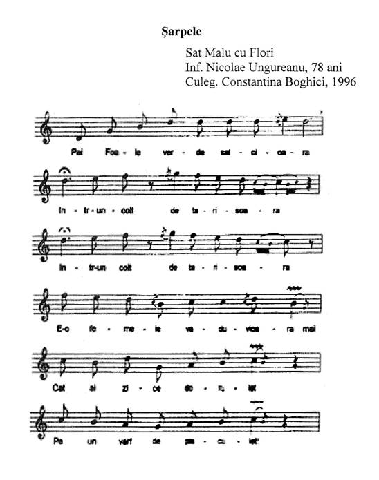 Melodica pe recitativ epic arhaic, datorata diatonismului si simplitatii constructiei, incadrandu-se intr-un eolic pur.
