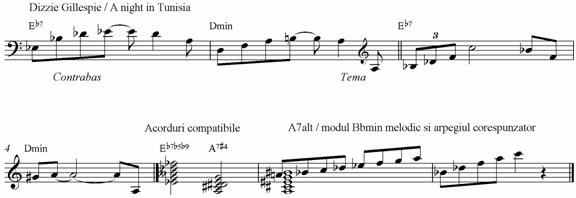 In exemplul 4A prezentam un caz de tratare specifica a unui acord major cu septima mica (in terminologia jazzului dominant chord). Prima masura in care basul arpegiaza sunete din componenta acordului Eb7 este o tipica inlocuire a acordului A7 b5 b9 cu un acord aflat la o cvarta marita distanta de acesta (Eb). Procedeul se numeste substitutie de cvarta marita (din englezescul substitution) si incepand din perioada be bop este unul dintre cele mai cunoscute artificii din armonia muzicii de jazz. Si pentru ca termenul substitutie este folosit si in algebra, am putea scrie mai clar: A7 b5 b9 = Eb7#11. In masura 3, odata cu intrarea temei se arpegiaza acordul Bbm Maj7 9 desi in cifraj este scris Eb7, iar acesta am vazut ca este o substitutie a lui A7. In concluzie Bbm Maj7 9 este si el o substitutie al lui A7 b5 b9#9 care in teoria jazzului se numeste altered chord (acord alterat) si se noteaza cu A7alt (vezi masura 5 a aceluiasi exemplu). In primul volum din Tehnica improvizatiei, la capitolul Relatia armonic-melodic in improvizatie am aratat ca pentru a construi o melodie intr-o relatie omogena cu un acord alterat avem la dispozitie sunetele unei game minor melodice construite pe o tonica aflata la un semiton superior fata de fundamentala acordului. Cu alte cuvinte fata de acordul A7alt avem la dispozitie sunetele lui Bb minor melodic si implicit arpegiul acestuia. Exact asa procedeaza si compozitorul in motivul principal al temei ce contine sunetele arpegiului de Bb minor melodic (cu septima si nona mare).