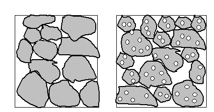 Betoanele macroporoase se obtin prin alegerea unei granulozitati speciale a agregatelor, care pot fi grele compacte sau usoare poroase. Partea fina din agregate se elimina partial sau total, iar cantitatea de ciment si apa se dozeaza astfel incat fiecare granula sa fie invelita cu o pelicula fina si uniforma de pasta de ciment, sudand granulele doar in punctele de contact, fara a umple golurile dintre ele (fig. V.29).
