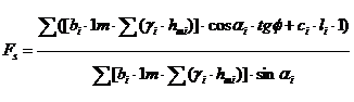 Se defineste drept grad de siguranta la alunecare a taluzului dupa cercul cosiderat raportul dintre momentul fortelor care asigura stabilitatea masivului asezat deasupra suprafetei de alunecare si momentul fortelor care produc alunecarea lui. Momentele se iau fata de centrul O al cercului de alunecare. Explicitand valorile fortelor si luand in considerare echilibrul intregului ansamblu de fasii se obtine expresia: