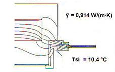 Fig. 2. Punte termica produsa de un stalpisor in zidarie: schema geometrica si camp termic; punct de temperatura minima unde condensul este favorizat