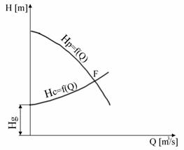 Punctul in care cele doua curbe se intersecteaza este punctul de functionare a pompei/pompelor in instalatia data. In acest punct se realizeaza cele doua egalitati necesare functionarii stabile: