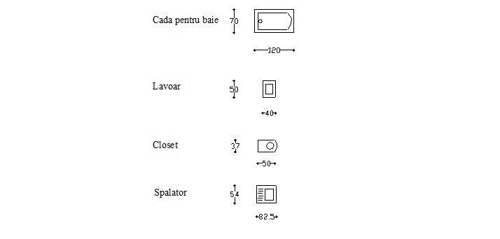 Obiectele sanitare se reprezinta pe planuri si in scheme prin semne conventionale , avind dimensiunile principale de gabarit ale obiectului reduse la scara 1 : 50 .