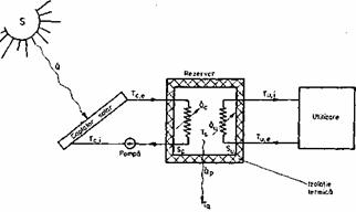 In lipsa radiatiei solare ar putea avea loc inversarea sensului de circulatie a apei, ceea ce ar conduce la cedarea caldurii stocate catre mediul ambiant. Pentru a evita aceasta, trebuie ca rezervorul de stocare sa fie dispus deasupra captatorului, astfel ca intre capetele conductei de legatura dintre partea superioara a captatorului si partea inferioara a rezervorului sa existe o diferenta de nivel de cel putin 0,3 m; in cazul unei diferente de nivel sub 0,3 m, trebuie folosita o supapa cu un singur sens. In exemplul prezentat energia auxiliara este 'injectata' in apa care pleaca de la rezervor spre consumator, pentru a o mentine - in orice conditii - la un nivel minim de temperatura impus de consumator.