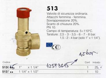 la cazane EKO-VIMAR - Orlan Standard si Orlan Super 1, la care presiunea de lucru este de 1,5 bar, se prevede supapa de siguranta Caleffi 1"-11/4", avand 1,5 bar, cod producator: 513615. La cazanele pana la 60 de kW o singura supapa de siguranta, la cazanele mai mari, minimum doua bucati.