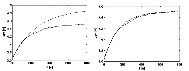Experimental, pentru uc=5V se asteapta pana procesul ajunge in regim stationar apoi se aplica o treapta de 0.5V. Utilizand masuratorile realizate in acest experiment pentru upv (figura 17 linie continua) s-a identificat urmatorul model de ordinul intai al parti fixate: