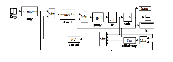 Pompa este antrenata de un motor de curent continuu cu magneti permanenti. Marimea de comanda a motorului este tensiunea de alimentare um iar ca iesire vom considera turatia motorului. Deoarece dinamica motorului este caracterizata de constante de timp mult mai mici decat ale procesului in care se regleaza nivelul, vom considera ecuatiile motorului in regim stationar: