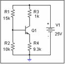 Pentru circuitul de mai jos, potentialul emitorului tranzistorului Q1 este aproximativ: a) 0.65 V; b) 15 V; c) 10V d) -9.3 V | ||