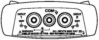 Intrarile comune ale Fluke43 (INPUT 1, rosie, ecranata; INPUT 2, gri, ecranata; COM, neagra, tip banana de 4mm) sunt conectate intern prin intermediul unei protectii proprii.
