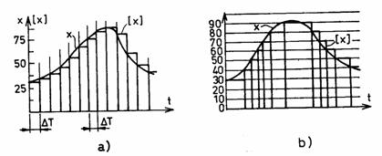 In figura 4.sunt prezentate diagramele celor dou tipuri de esantionare. In primul caz, din m rimea de m surat se extrag esantione la intervale de timp egale si fiec rui esantion i se asociaz cel mai apropiat num r de cuante, num rate din momentul initial al esantion rii, pe cand in al doilea caz m rimii de m surat i se asociaz num rul de cuante corespunz tor ultimului nivel cuantificat prin care a trecut.